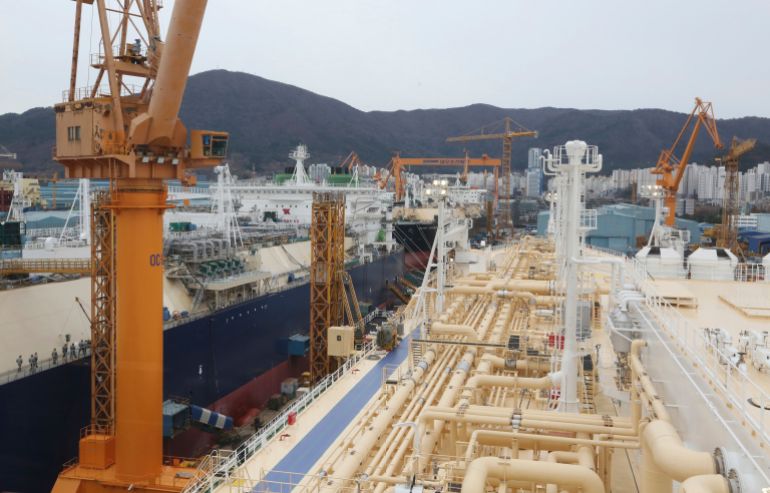 Liquefied natural gas (LNG) carriers under construction at the Daewoo Shipbuilding and Marine Engineering facility on Geoje Island, South Korea, on December 7, 2018 [Ahn Young-joon/AP]