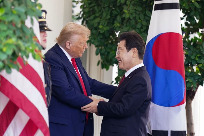 President Donald Trump greets South Korean President Lee Jae Myung outside the West Wing of the White House in Washington on August 25, 2025. Photo by Al Drago/UPI | License Photo