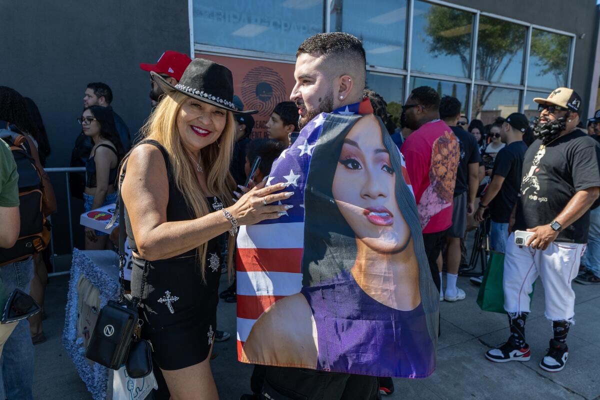 Torres stood near the front of the line, which he joined around 10:30 a.m. Next to him was Arlene Heaton of Rosamond, who had just driven three hours from the Kern County community to arrive at the same time. The two met in line and quickly became friends — she donning a rhinestone-studded ensemble and he draping a flag depicting Cardi B around his shoulders.