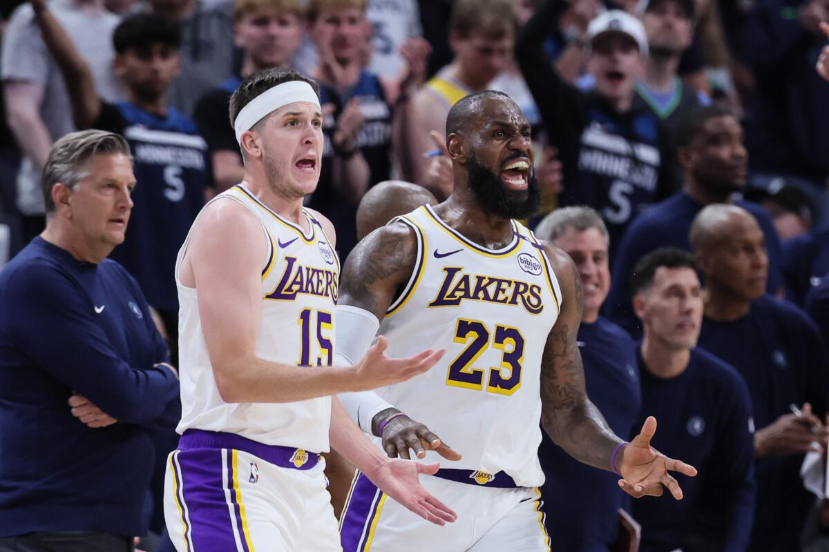 Lakers forward LeBron James (23) and teammate Austin Reaves react to a referee’s call during a 2025 NBA playoff game against Minnesota.
