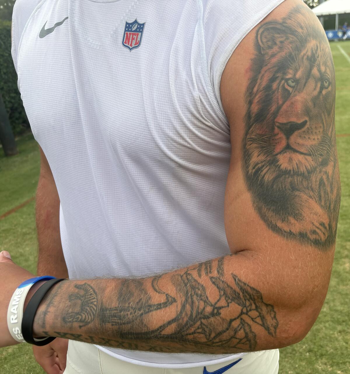 Rams linebacker Nate Landman shows tattoos on his left arm of a lion, giraffe and zebra from his native Zimbabwe.