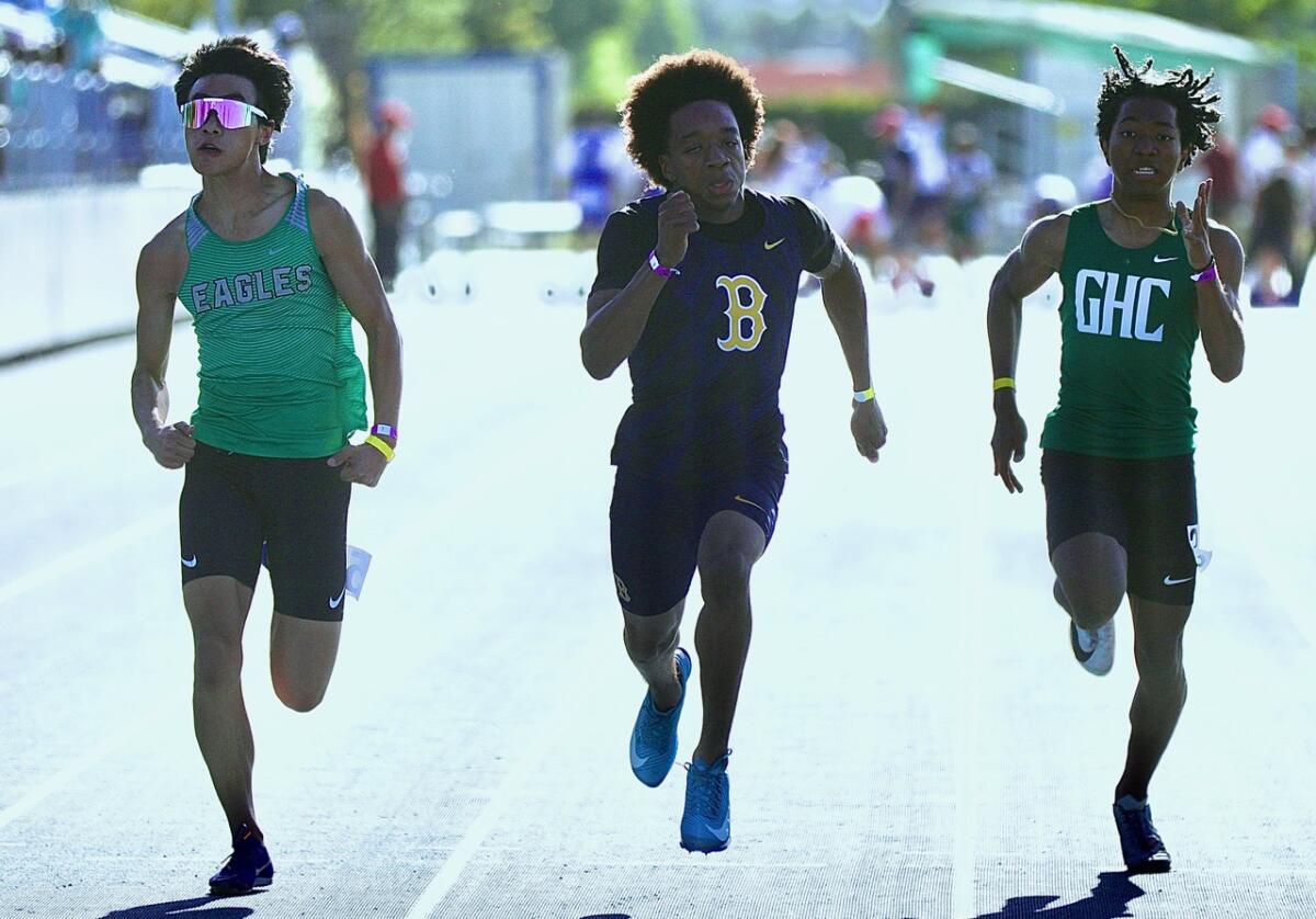 Senior Antrell Harris, center, of Birmingham was first in the 100 and 200 meters at the City Section finals May 22 in Lake Balboa.