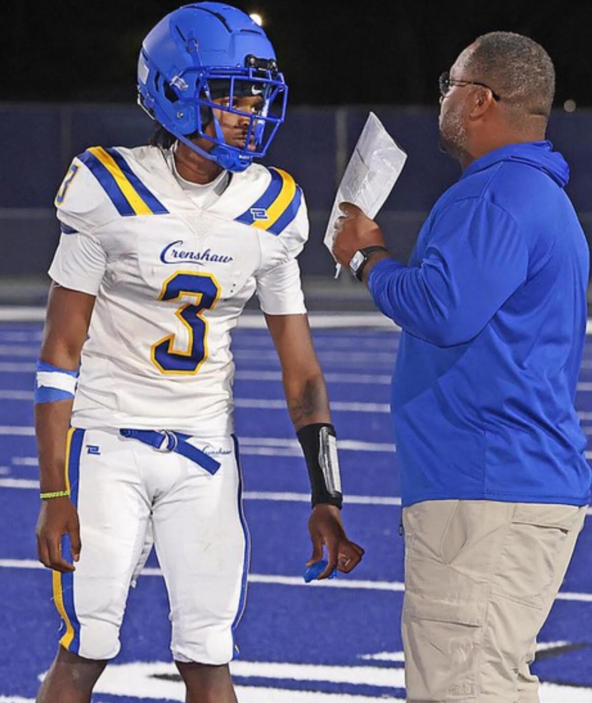 Crenshaw interim coach Terrance Whitehead speaking with quarterback Daniell Flowers.