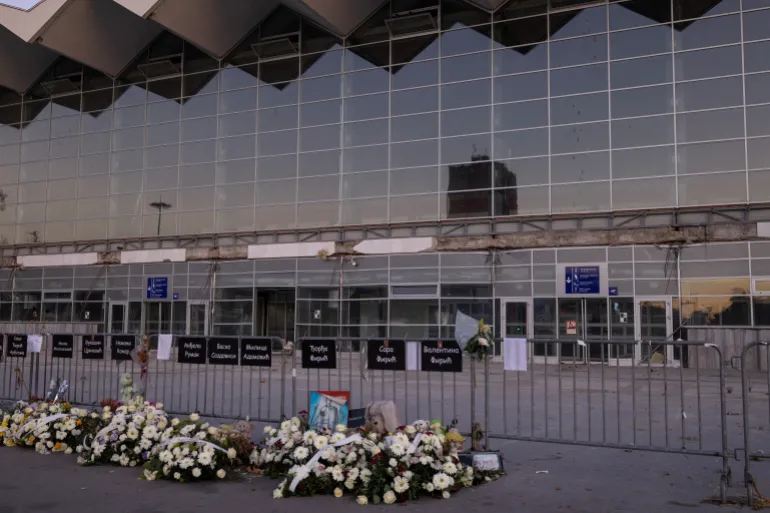 Flowers are laid under the names of victims at the entrance of the Novi Sad railway station [Alkis Konstantinidis/Reuters]