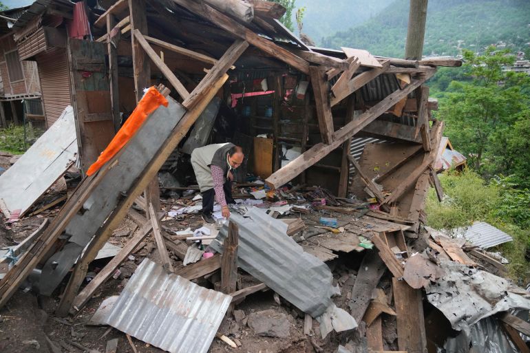 A person inspects his damaged shop following overnight shelling from Pakistan at Gingal village in Uri district, Indian-administered Kashmir [Dar Yasin/AP Photo]