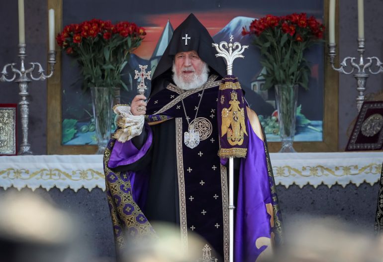 In November 2020, Catholicos of All Armenians Karekin II led a memorial service to mark Remembrance Day for the Armenian soldiers killed in the fighting over Nagorno-Karabakh, in the apostolic Etchmiadzin Cathedral in Vagharshapat, Armenia [File: Hayk Baghdasaryan/Photolure Handout via Reuters]