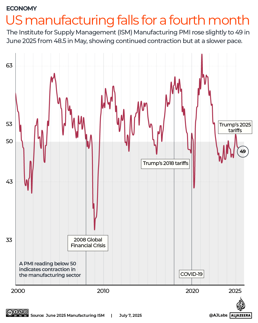In June, it registered 49 percent, marking a fourth consecutive month of contraction, though the rate of decline has slowed.