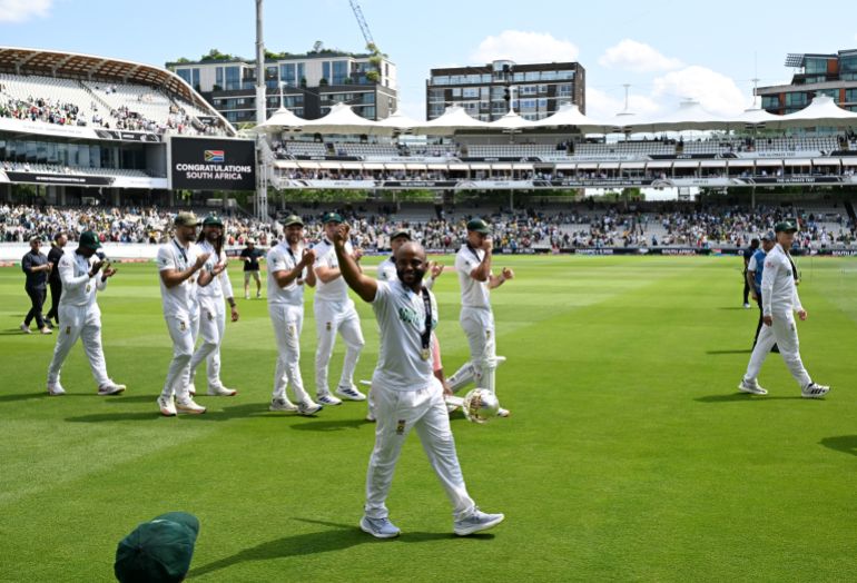 Temba Bavuma of South Africa celebrates with the fans as he walks around the pitch at Lord’s Cricket Ground in London, England [Mike Hewitt/Getty Images]