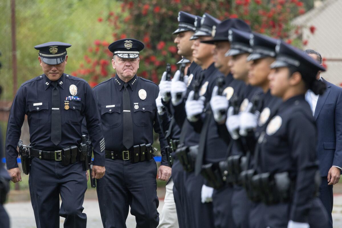 LAPD Chief Jim McDonnell, center, and Capt. James Hwang perform the uniform inspection during graduation for recruit class 11-24 on May 2.
