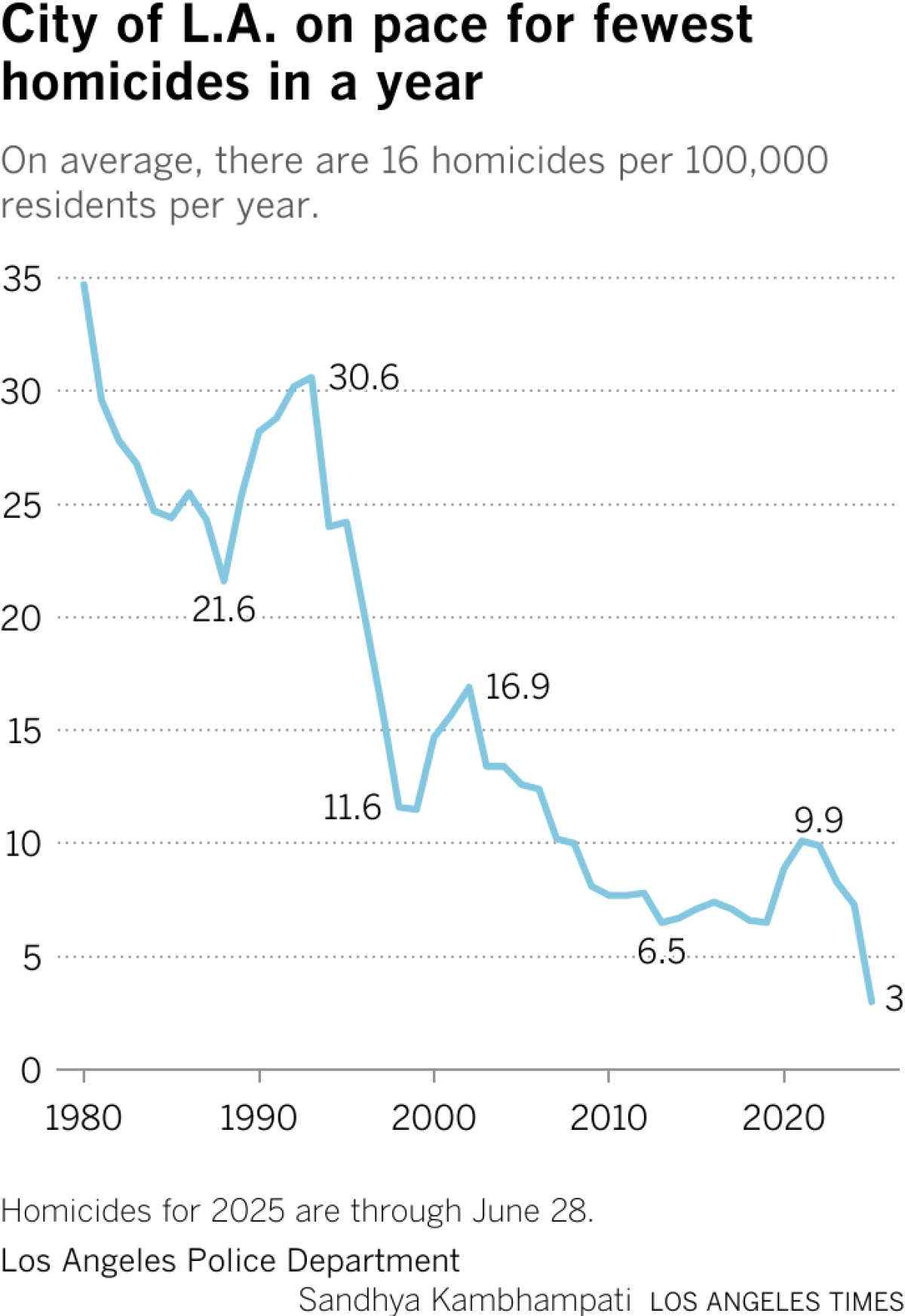 Although violent crime persists in parts of the city, homicides overall in L.A. have dropped to 116 through June 28, the most recent date for which reliable data were available, compared to 152 in the same period last year.