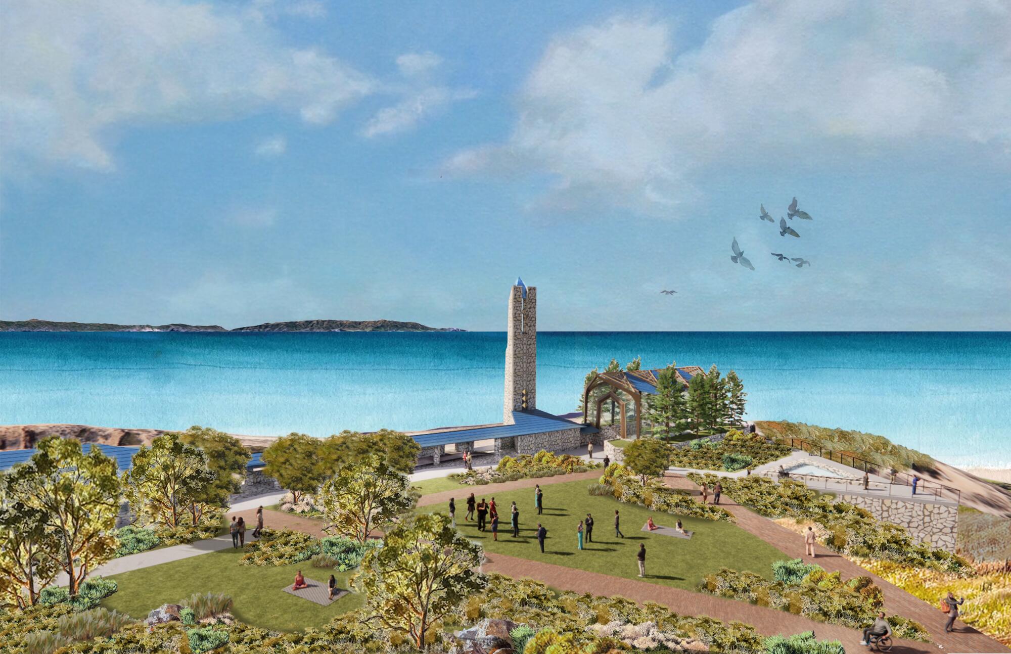 A watercolor-style rendering shows a glass and timber chapel and a stone tower sit on a bluff overlooking the ocean.