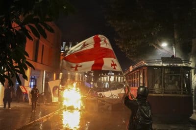![A protester receives help after being hit by tear gas during clashes with riot police during an opposition rally on the day of local elections in central Tbilisi on October 4, 2025. [Giorgi Arjevanidze/AFP]](https://www.aljazeera.com/wp-content/uploads/2025/10/000_77Q38ZY-1759601753.jpg?w=770&resize=770%2C513&quality=80)