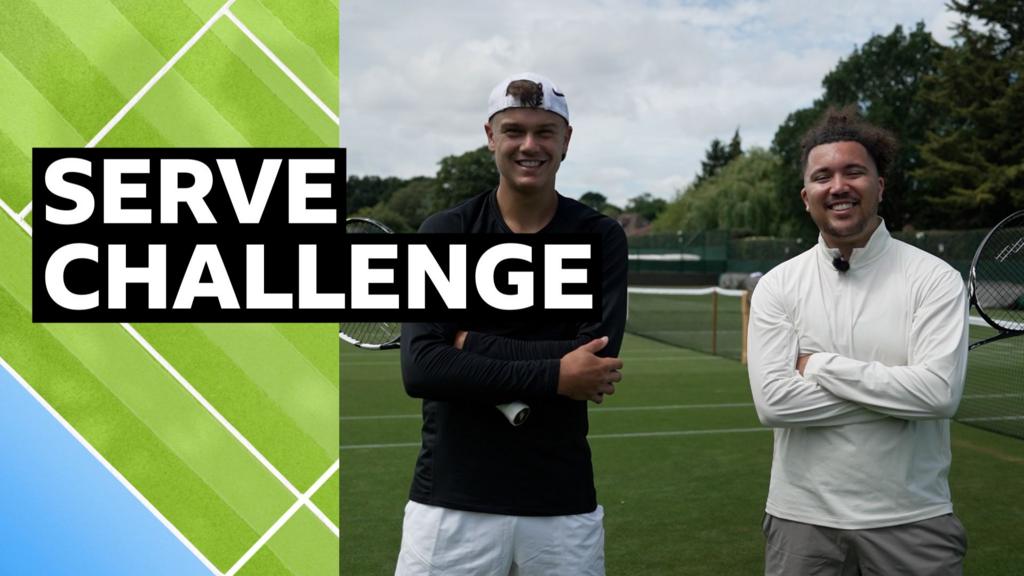 BBC Sport presenter Sam Harris tries to return a serve from men’s world number eight Holger Rune.