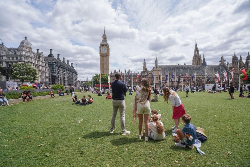 People enjoying the sunshine in Parliament Square on a hot day in London on MondayCredit: Alamy