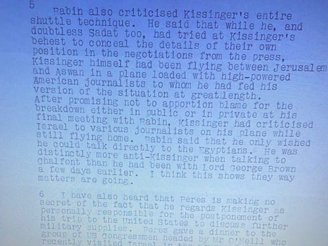 British Foreign and Commonwealth Office (FCO) files show that the US NSC told British Ambassador Peter Ramsbotham “in confidence” that Ford’s message to Rabin had been “very tough” and had referred critically to Israeli stubbornness during the negotiations.