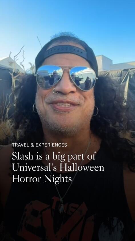 We talked to Slash about a week before Halloween Horror Nights opened from Orlando, Fla., where he was holed up recording an album with his band the Conspirators. That work, he says, will be released in 2027 due to planned 2026 touring obligations with Guns N’ Roses. He lamented that he wouldn’t have time to visit Walt Disney World and Universal’s new Epic Universe. The latter Florida park is home to a monsters-themed land that Slash said he was eager to see.