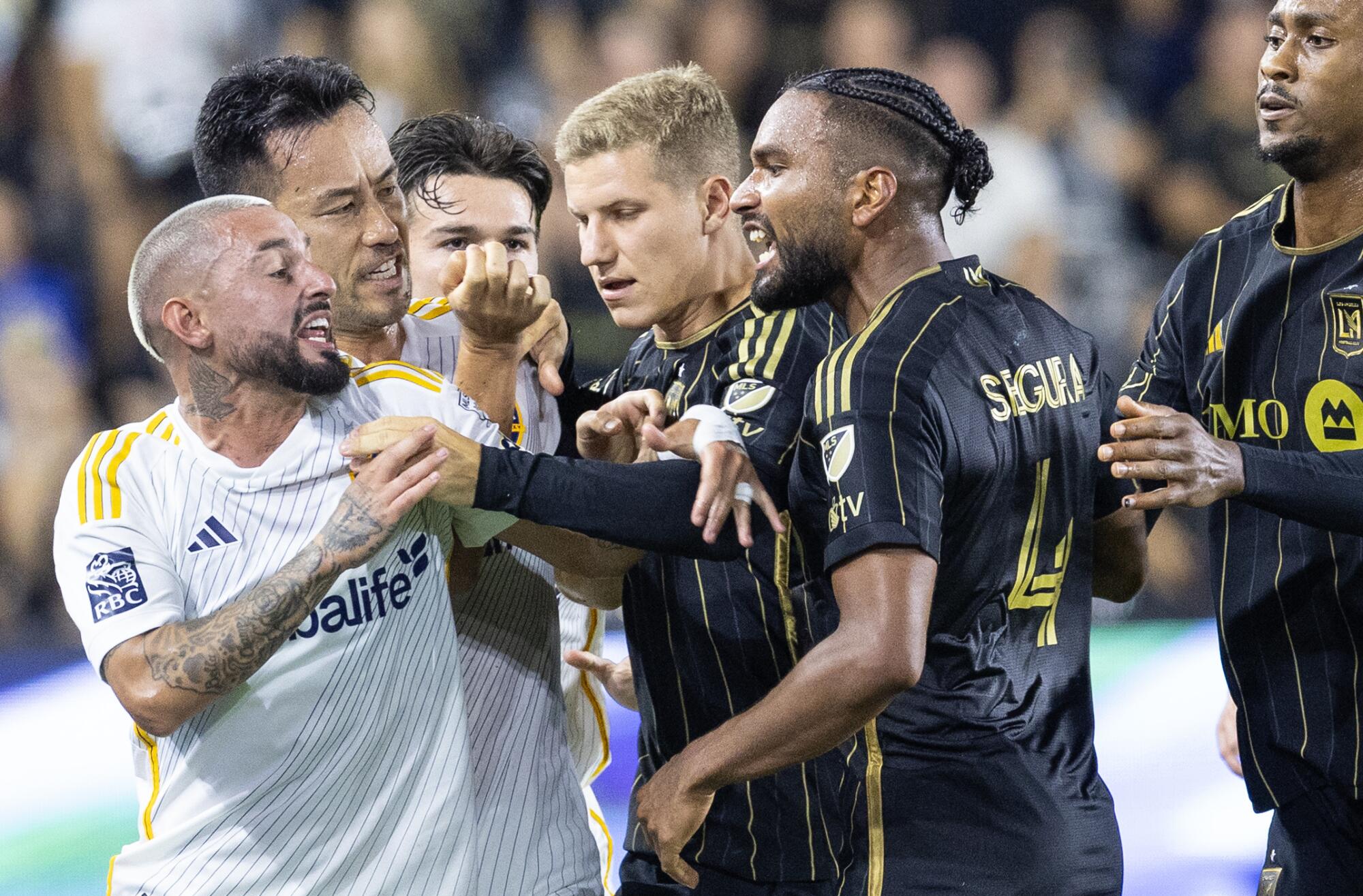 Galaxy and LAFC players get into a on-field scuffle during Saturday’s 3-3 draw at BMO Stadium.