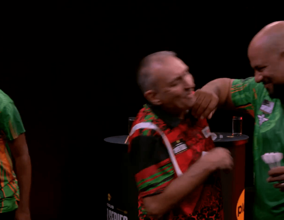 Devon Peterson playfully pretended to punch Richie Burnett after Wales got the better of South Africa in the Modus Super Series International PairsCredit: X @MSSdarts
