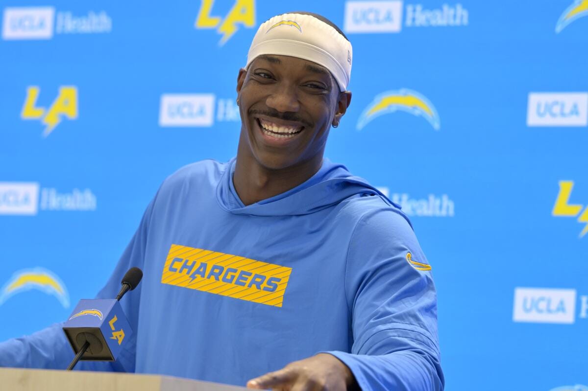 Jim Harbaugh can’t help but smile when talking about Gadsden. Asked about the Chargers’ rookies — and the efforts they’ve put in to keep the team afloat amid a rash of injuries — the usually stoic Chargers coach remarked about how wide his grin was before slamming his hands down onto the podium in front of him.