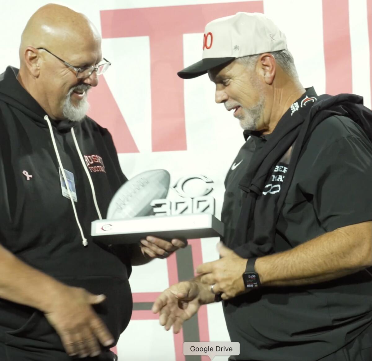Corona Centennial coach Matt Logan (right) receives trophy from athletic director Tony Barile after 300th coaching win.