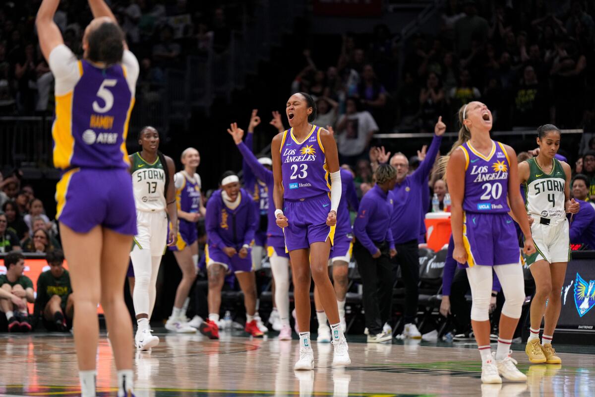 Seattle’s Gabby Williams set the tone early with six steals in the first half. She finished with eight, along with 11 points and seven assists. The Storm scored 31 points off 24 Sparks turnovers, with 24 of those points coming on fast breaks.