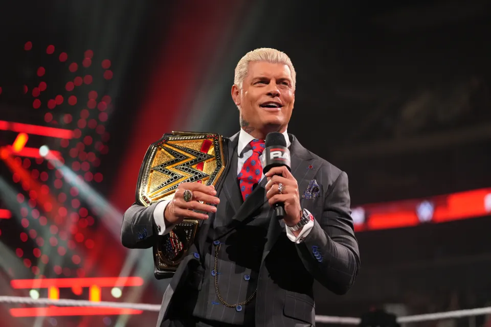Cody Rhodes holding the Undisputed WWE Championship and a microphone.