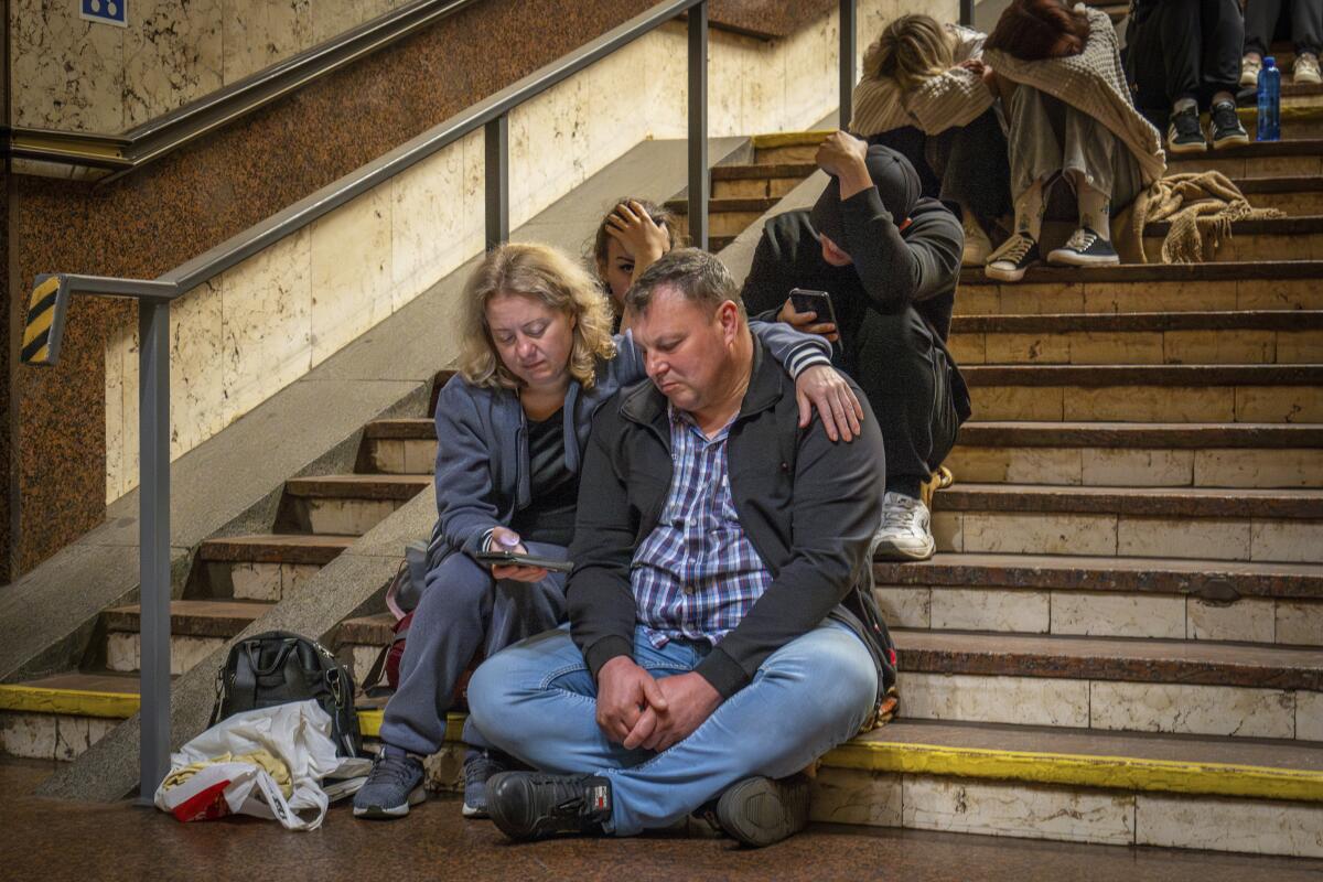 People rest in a metro station, being used as a bomb shelter, during a Russian drone attack in Kyiv, Ukraine, on Friday.