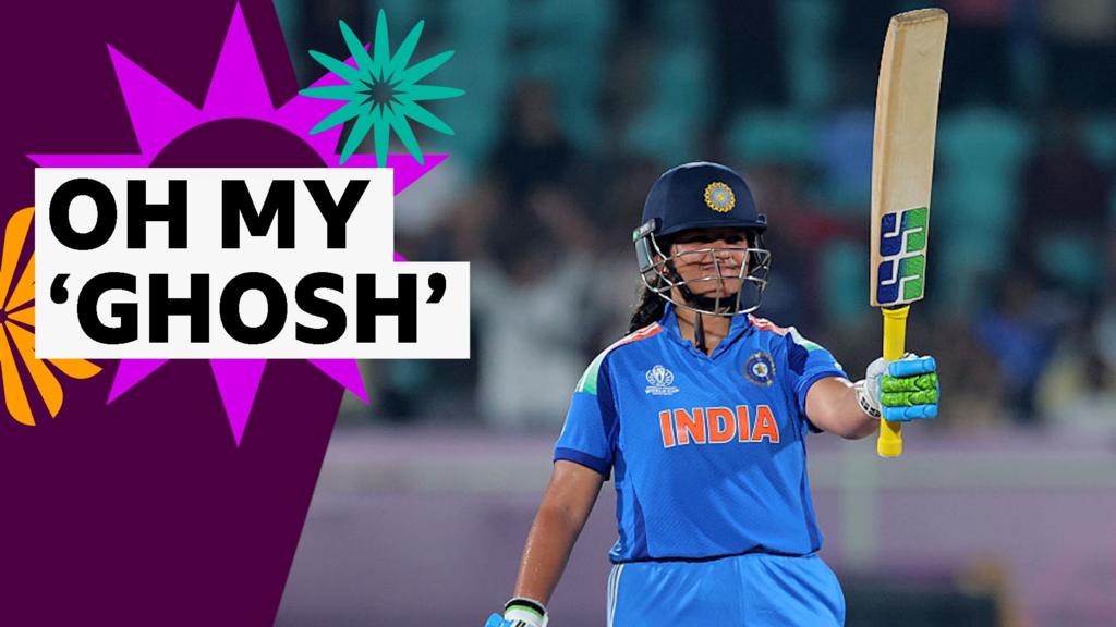 Richa Ghosh’s 94 runs off 77 balls, including 15 boundaries, helps save India’s innings as they recover from 102-6 to reach 251-8 against South Africa in their ICC Women’s Cricket World Cup match.
