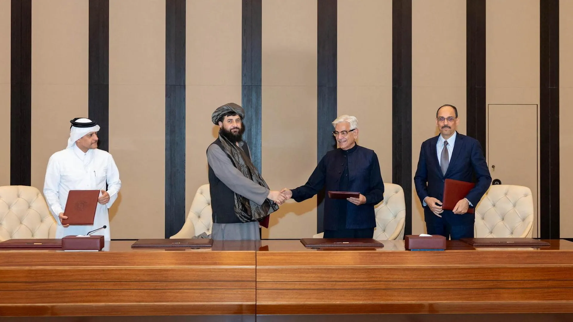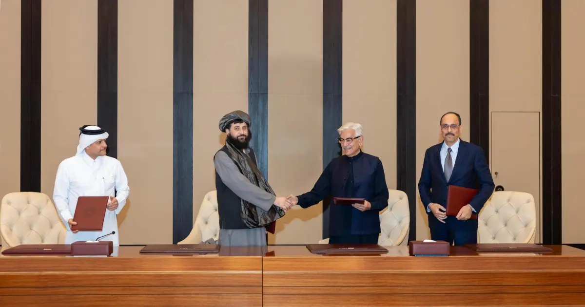 Afghan Defence Minister Mullah Mohammad Yaqoob Mujahid and Pakistani Defence Minister Khawaja Muhammad Asif shake hands following the signing of a ceasefire agreement, during negotiations in Doha, Qatar, October 19, 2025 [Handout/Qatar Ministry of Foreign Affairs via Reuters]