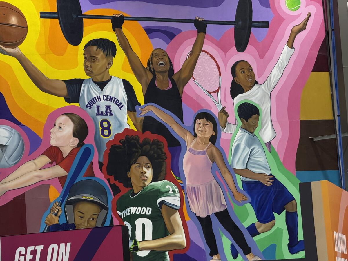 One of the murals at the new interactive sports exhibition at California Science Center.