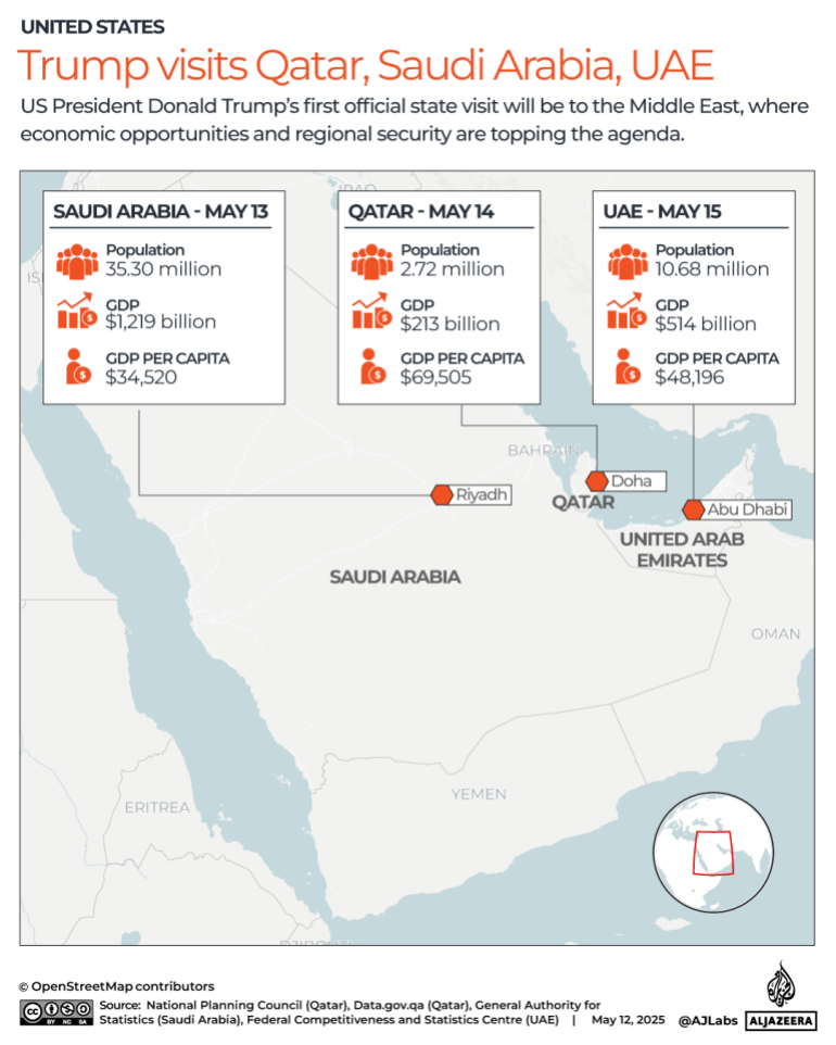 United States President Donald Trump descends on Tuesday on the Middle East for a regional tour that will begin in Saudi Arabia and include stops in the United Arab Emirates and Qatar. It is a business trip in every sense of the term, involving potentially trillions of dollars in investment and trade deals.