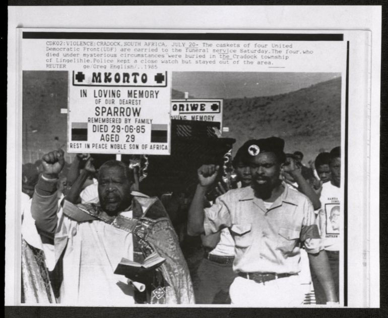 The coffins of the Cradock Four were carried to their funeral service in the Cradock township of Lingelihle in South Africa, on July 20, 1985 [Greg English/Reuters]