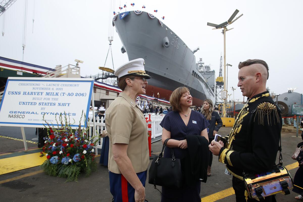 Marine Col. Alison Thompson, left, talks with Jenn Onofrio, center, a White House Fellow to the secretary of the Navy and Patrik Gallineaux, right, of the Richmond/Ermet Aid Foundation prior to the launching of the USNS Harvey Milk, a fleet replenishment oiler ship named after the first openly gay elected official in 2021 in San Diego.