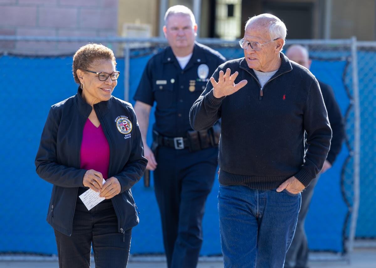 Los Angeles Mayor Karen Bass, left, and her disaster recovery czar Steve Soboroff, right, at Palisades Recreation Center in January.