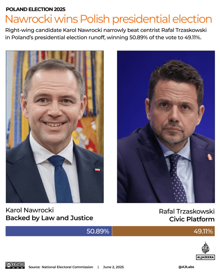 Karol Nawrocki, Poland’s right-wing opposition candidate, narrowly won the second round of voting in the country’s presidential election on Sunday, according to the National Electoral Commission (NEC).