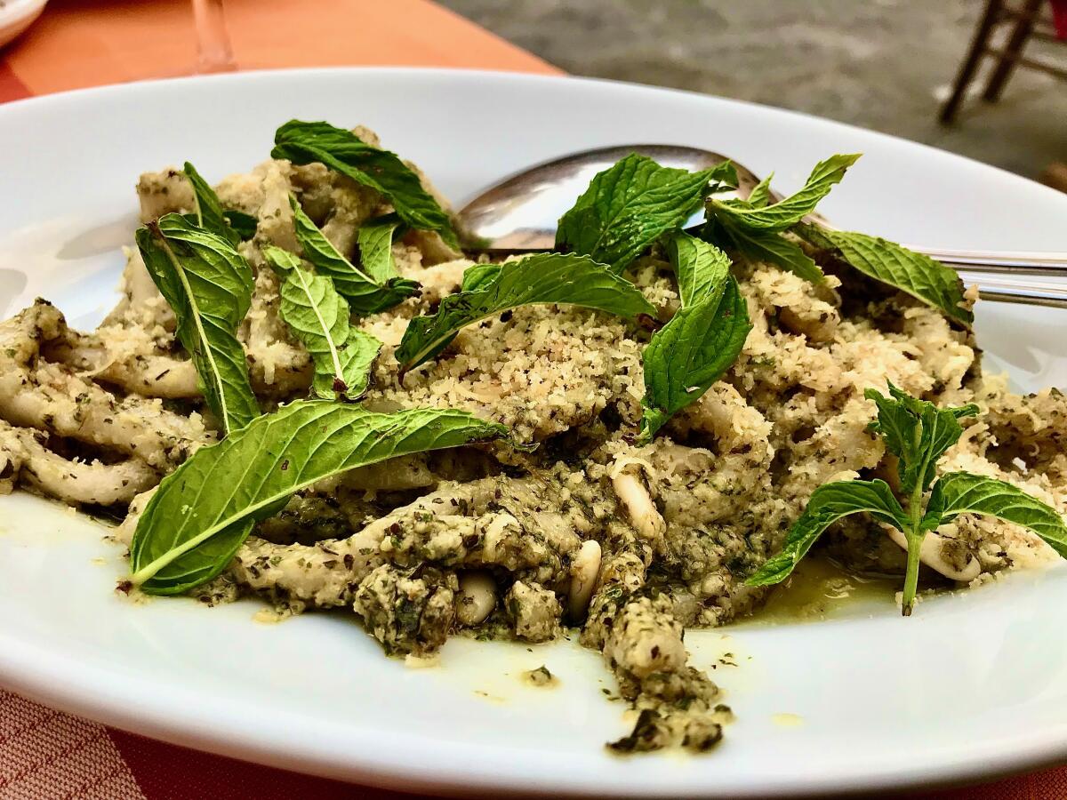Pasta with wild mint pesto made with walnuts and pine nuts at Massimo Giavannini’s Osteria La Vecchia Rota.