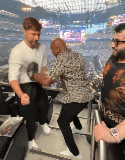 Man kneeling down while Mike Tyson laughs in the background.