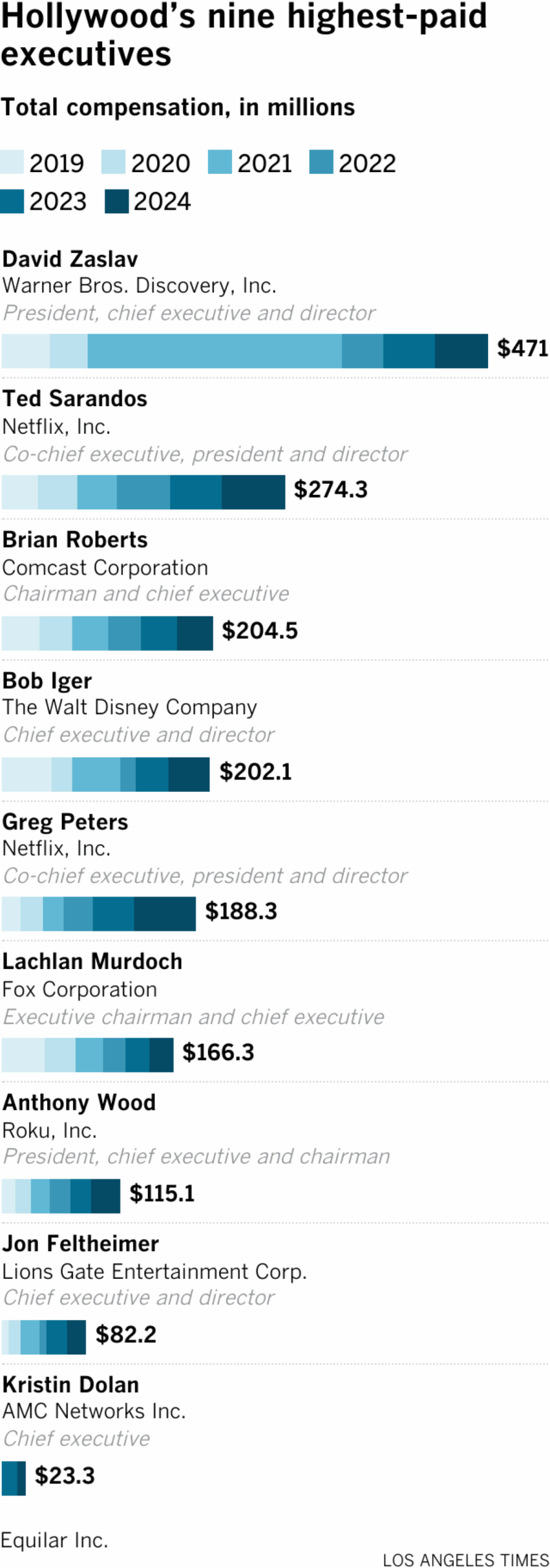 Although 2024 was a bad year for Hollywood, it was a very good year for some of the industry’s top executives, according to a survey of data by Equilar, which studies executive pay, for The Times.
