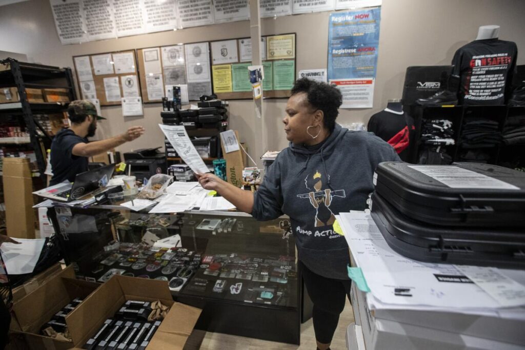 Geneva Solomon, right, works through a crush of paperwork for gun purchasers at Redstone Firearms in Burbank. Solomon runs the store with her husband Jonathan.