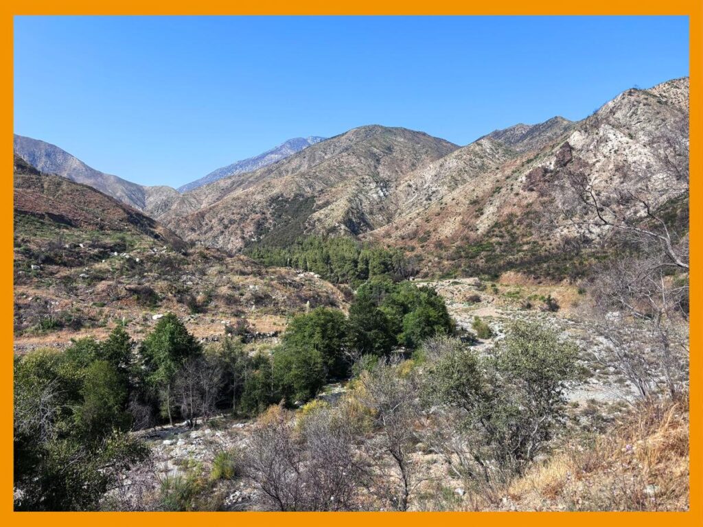 Continuing forward, I observed a healthy-looking canyon surrounded by hillsides and mountains that were varying levels of bare. There were leafy green pines and walnut trees near the river and blackened (possibly dead) manzanita and other chaparral up on the mountains.