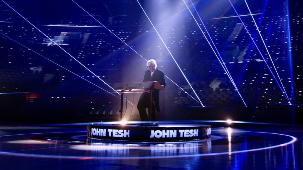 John Tesh plays “Roundball Rock” in an NBC Sports promo for its NBA coverage.