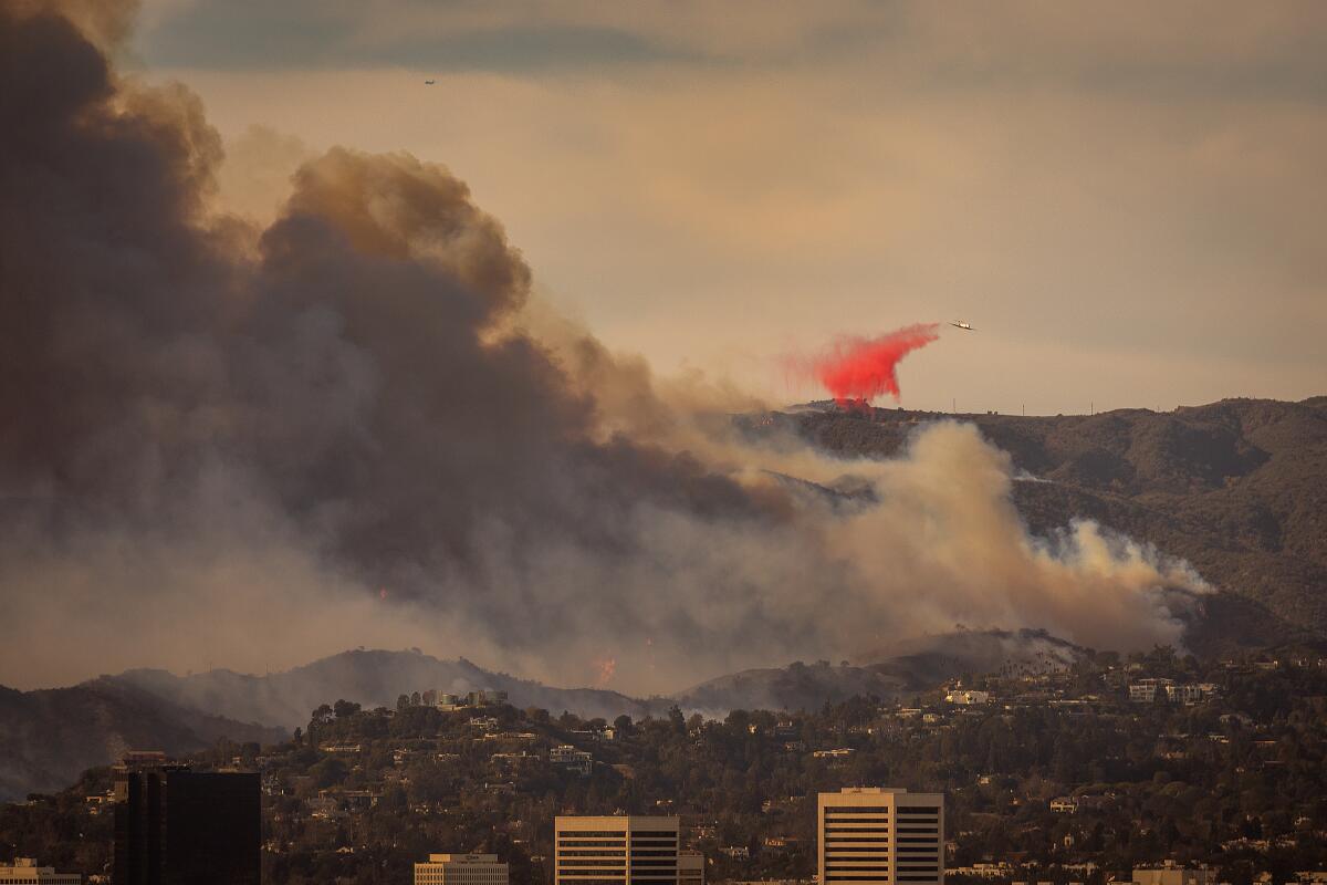 An aircraft drops fire retardant on the Palisades fire on Jan. 8, 2025.