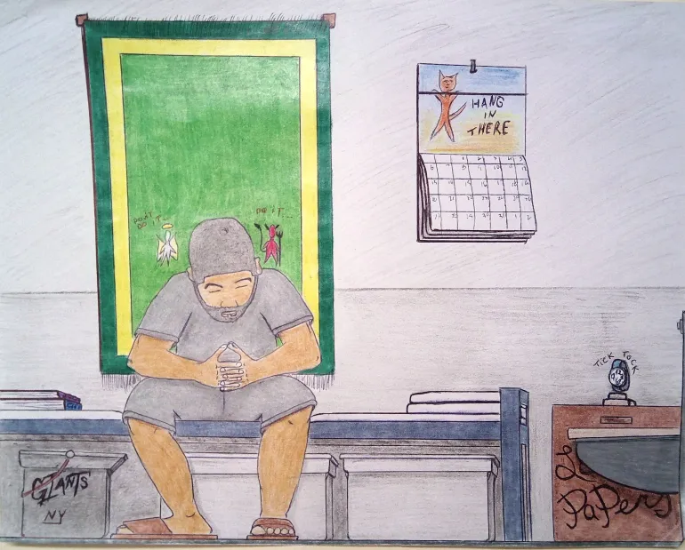 Martin Robles is also a prisoner at NJSP. These illustrations were made using lead and coloured pencils. As he has limited art supplies, Robles used folded squares of toilet paper to blend the pigments into different shades and colours.