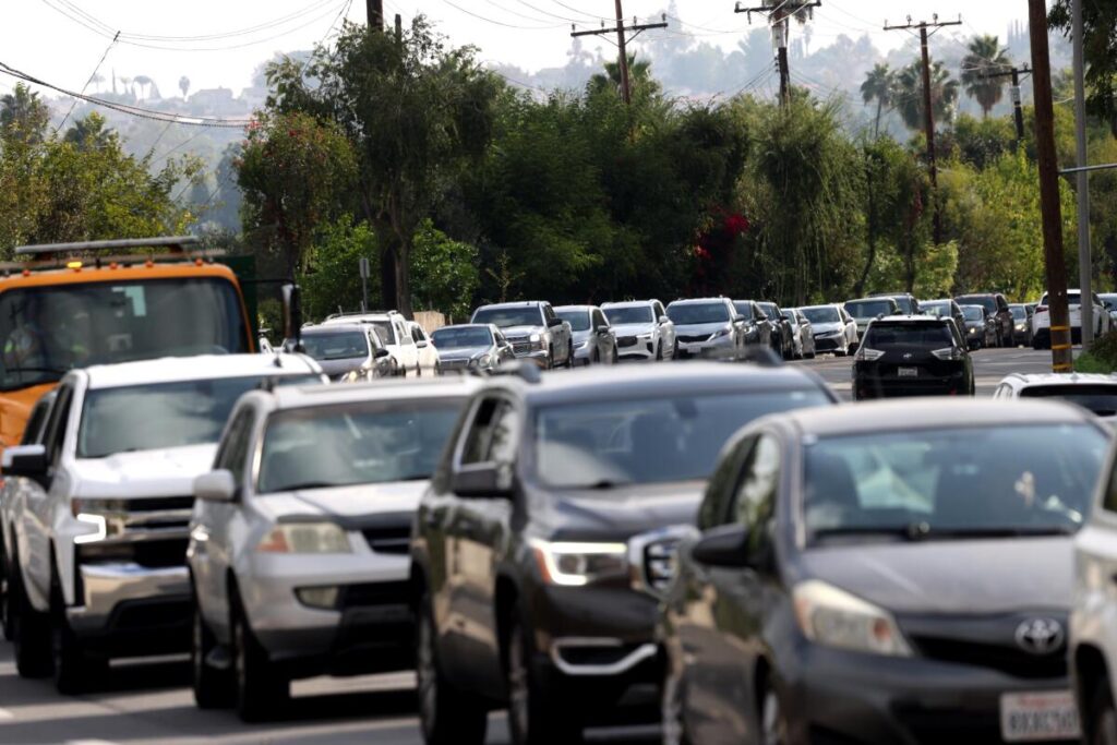 A line of cars stretches more than a mile as people wait to receive a box of free food provided by the L.A. Food Bank in the City of Industry on Wednesday.