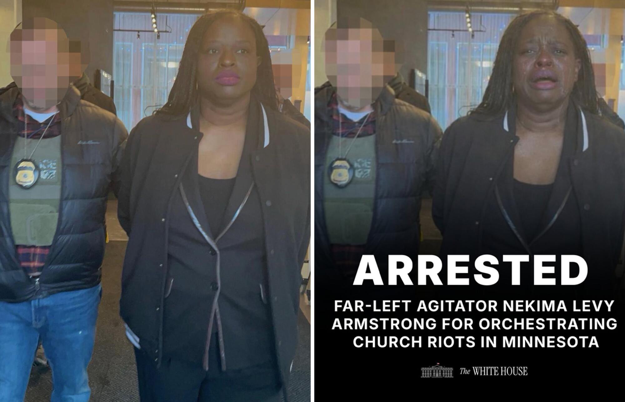 On the left, a photograph from the X (formerly Twitter) account of U.S. Secretary Kristi Noem, showing Nekima Levy Armstrong being arrested. On the right, the photo has been altered before being posted to the White House’s X (formerly Twitter) account.