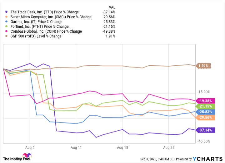 However, I’m sure that investors in The Trade Desk (TTD 0.23%), Super Micro Computer (SMCI -0.76%), Gartner (IT 3.83%), Fortinet (FTNT 3.06%), and Coinbase (COIN -2.49%) welcome September anyway. That’s because these five stocks were the five worst performers in the S&P 500 during August, dropping between 19% and 37% during the month.