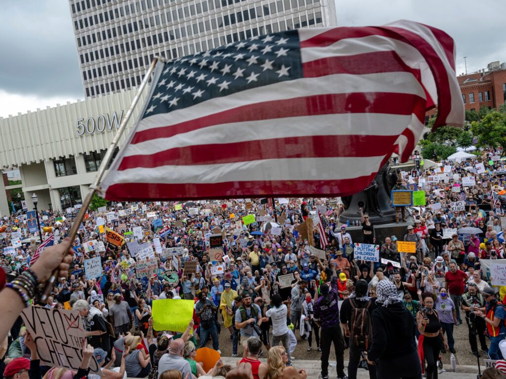 As armoured vehicles rolled down the street in front of the president, millions of people packed into streets, parks and plazas across the US as part of the so-called “No Kings” protests, marching through city centres and small towns, blaring anti-authoritarian chants mixed with support for protecting democracy and immigrant rights.