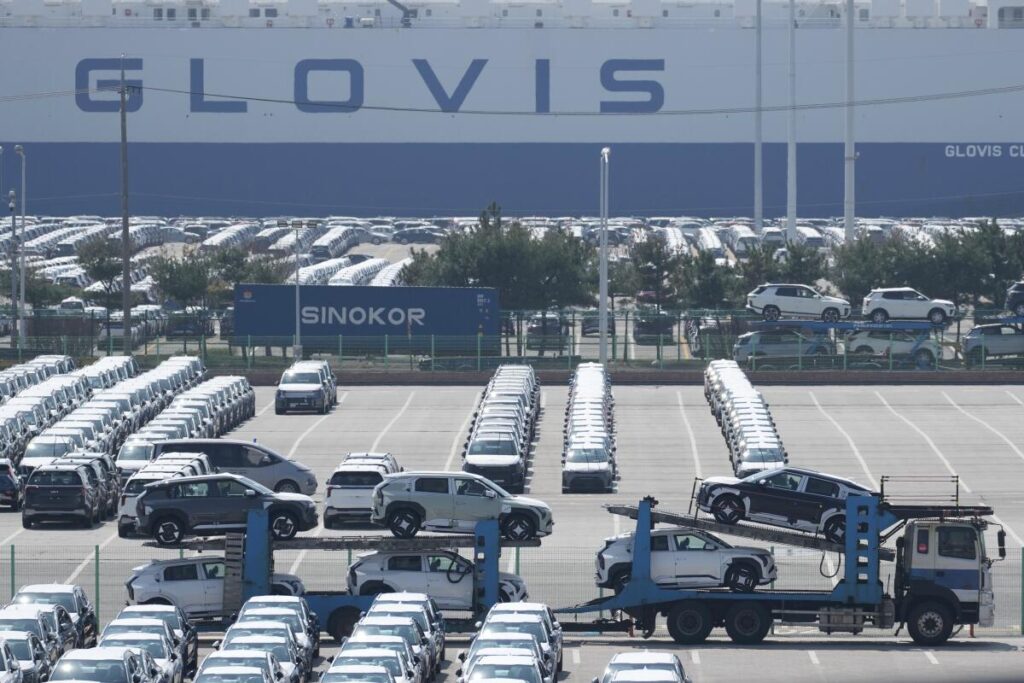 New cars for export on a car carrier trailer arrive at a port in Pyeongtaek, South Korea, on April 15, 2025.