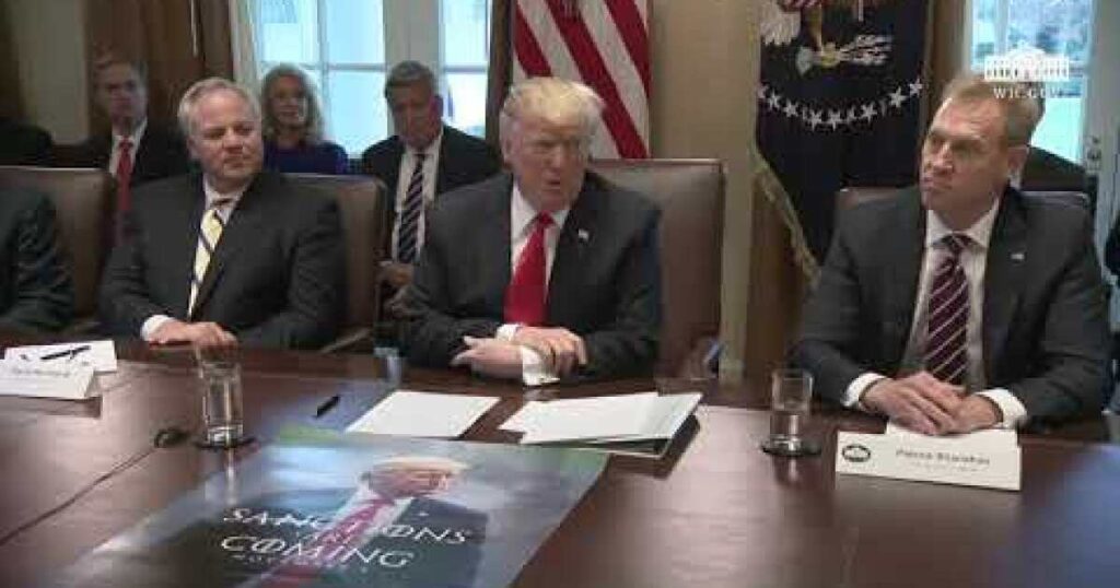 As Trump spoke, a “Game of Thrones”-style movie poster teasing Iran sanctions — “SANCTIONS ARE COMING,” it read — lay unfurled across the table directly in front of him. But he made no remarks on the subject.