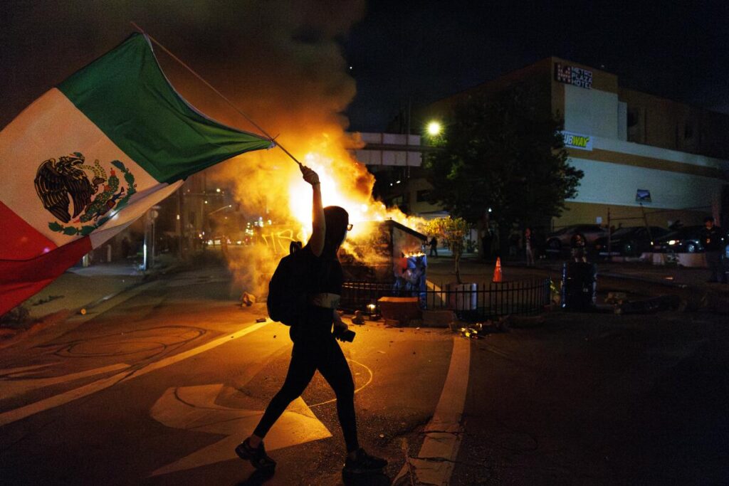 A demonstrator waves a Mexican flag in front of a dumpster fire Sunday after another night of unrest during a protest against immigration raids in Los Angeles.